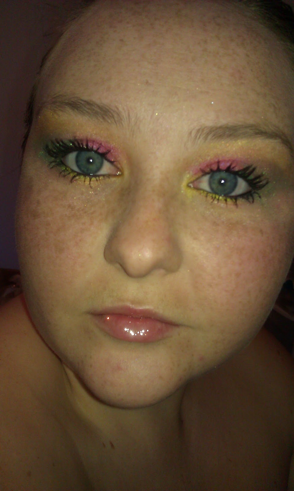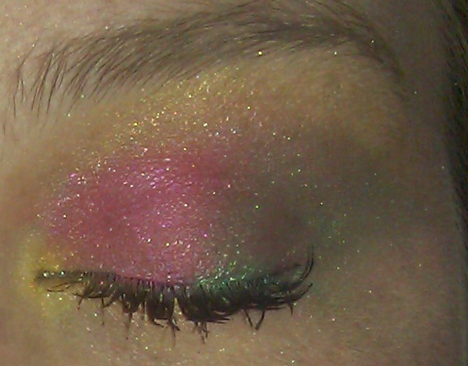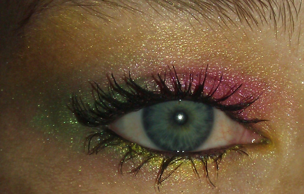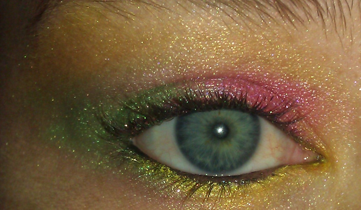 Okay so I was trying to think of a costume for my friend to go as and it was tough. Her boyfriend is going as a pirate so that leaves…pirate or wench? She wasn’t really feeling either one. Then it came to me: Parrot! So here is the eyeshadow I thought would look fun and bright, paired with something fabulously feathered of course!